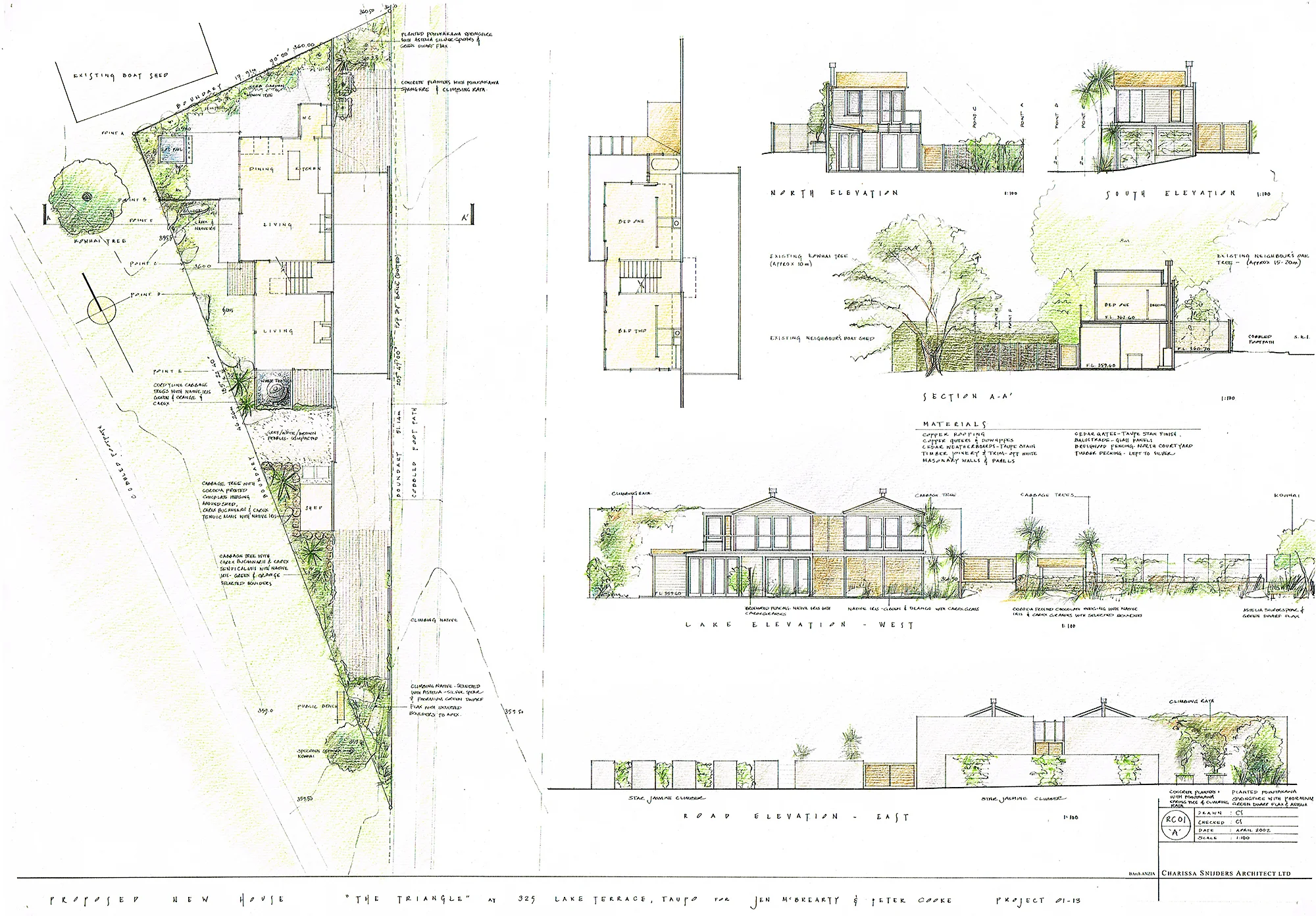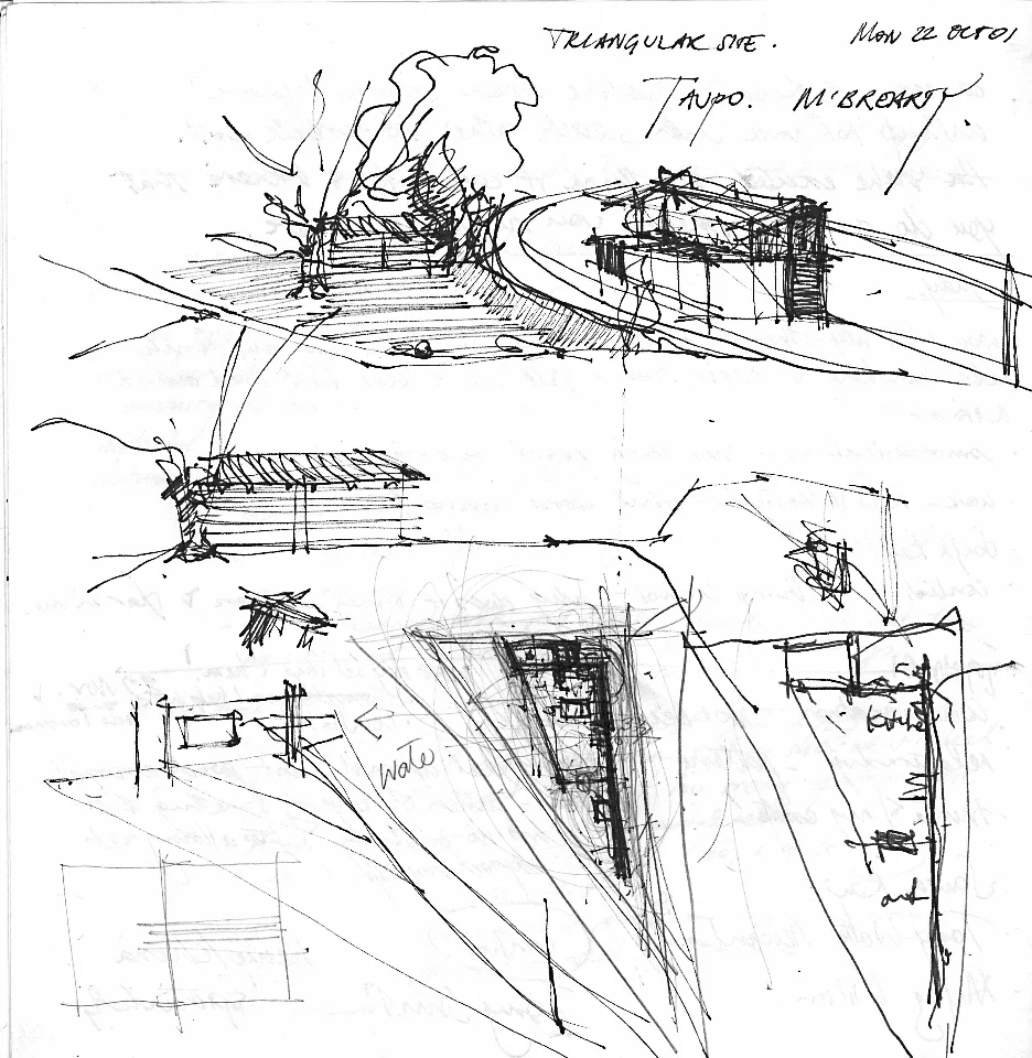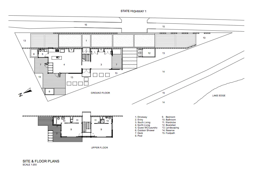 The client’s brief was to create a special lakeside dwelling that offered a quintessential New Zealand experience for international and national guests. The design is an imaginative response to the brief and an unusual triangular site opening onto Taupo’s lakefront reserve. The small piece of land presented unique challenges, particularly access, road noise, privacy, security and a Notified Resource Consent.