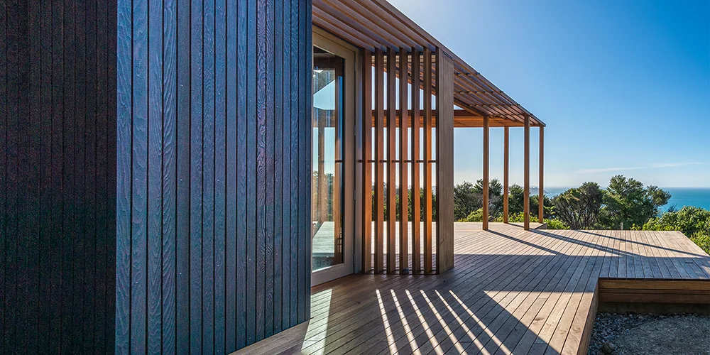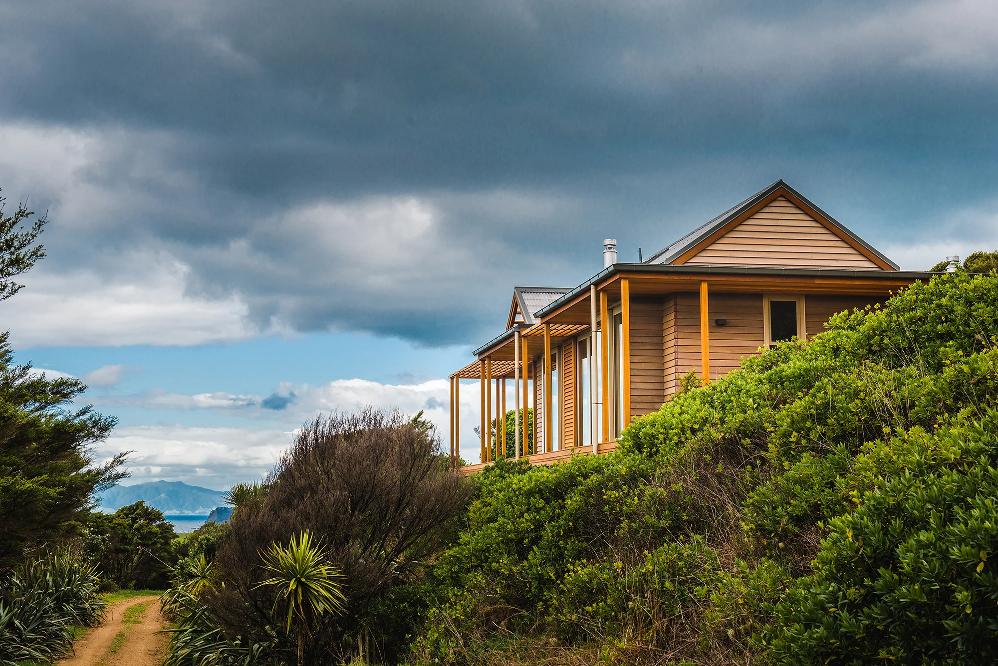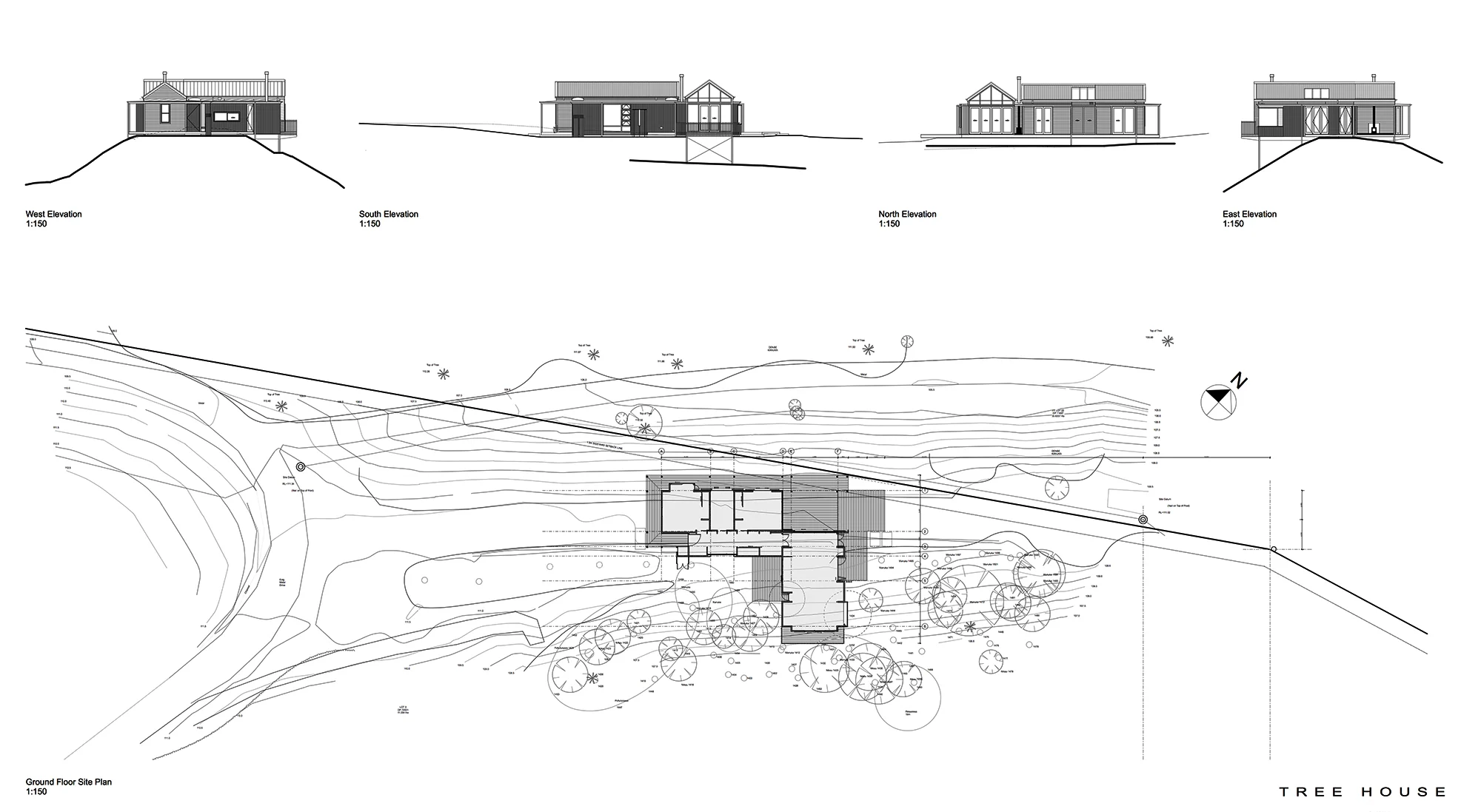 The Treehouse rests lightly on a tongue of land on Waiheke Island. The intimate living wing cantilevers into and is sheltered by the native trees to the south and extends to the north with the Outdoor room framing the panoramic sea views. The sea views are held to the east by the Coromandel, then Great and Little Barrier Island, as it stretches westward to Tawharanui Peninsula and Rakino Island.