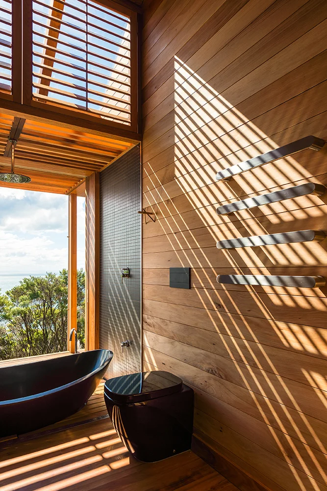 The palette of materials reflects both this simplicity and richness. Juxtaposing warm timber and moments of stone, the Treehouse is a testament to the beauty and power of natural materials. Salvaged Matai graces the floor and sustainable sourced NZ farmed Totara line its walls and form shelving to store holiday memorabilia along the passage. It imbues the magical qualities of native forest and seeks the praise of shadows as well as the light. Its ever-changing kaleidoscope of patterns, texture and view shafts – both day and night, are a constant delight and helps to uplift the senses and awaken one’s joy for life.
